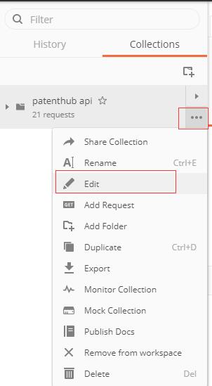 3、根据图指示,将鼠标移动到patenthub api上面,点击...,然后点击Edit。
